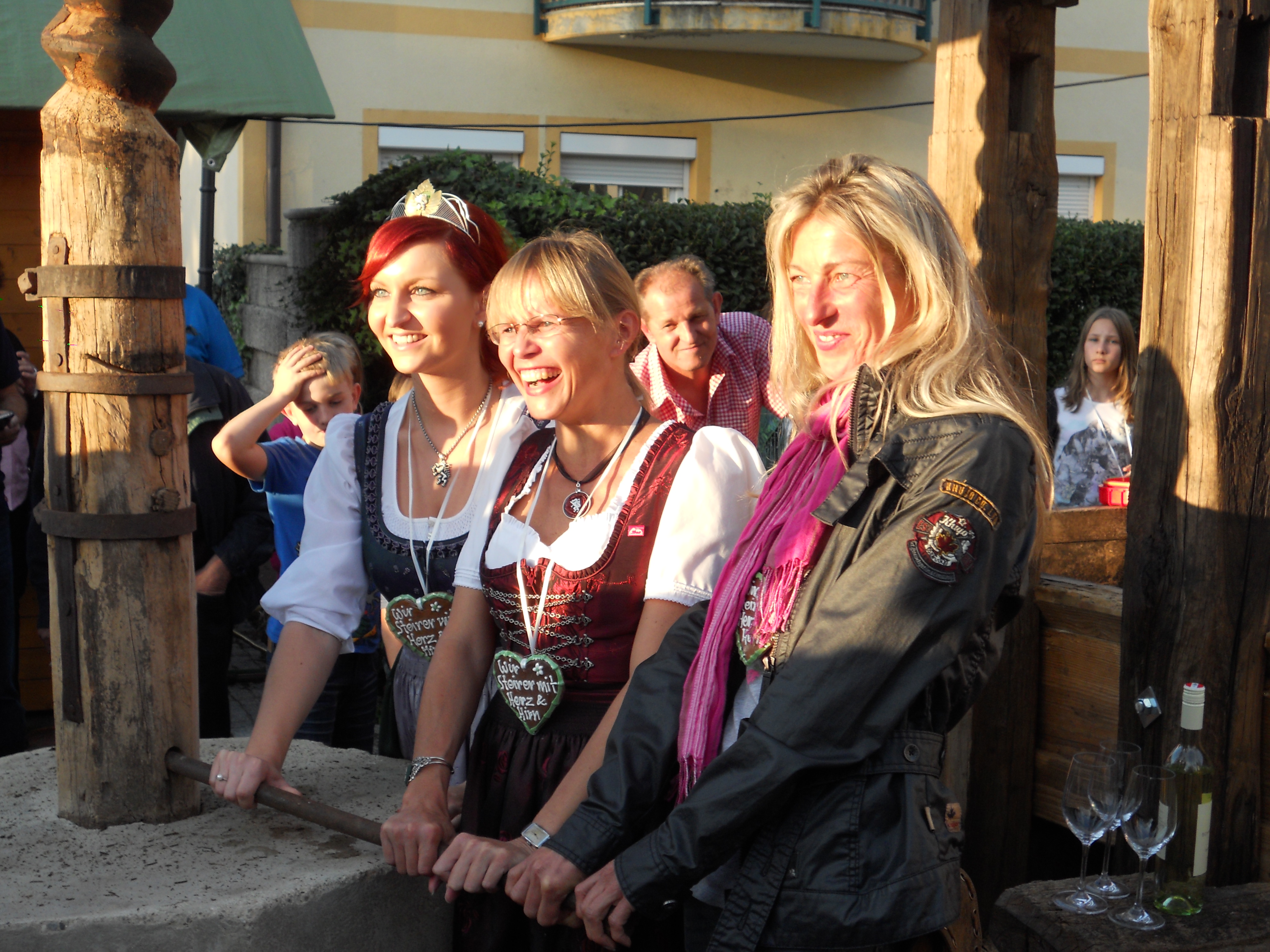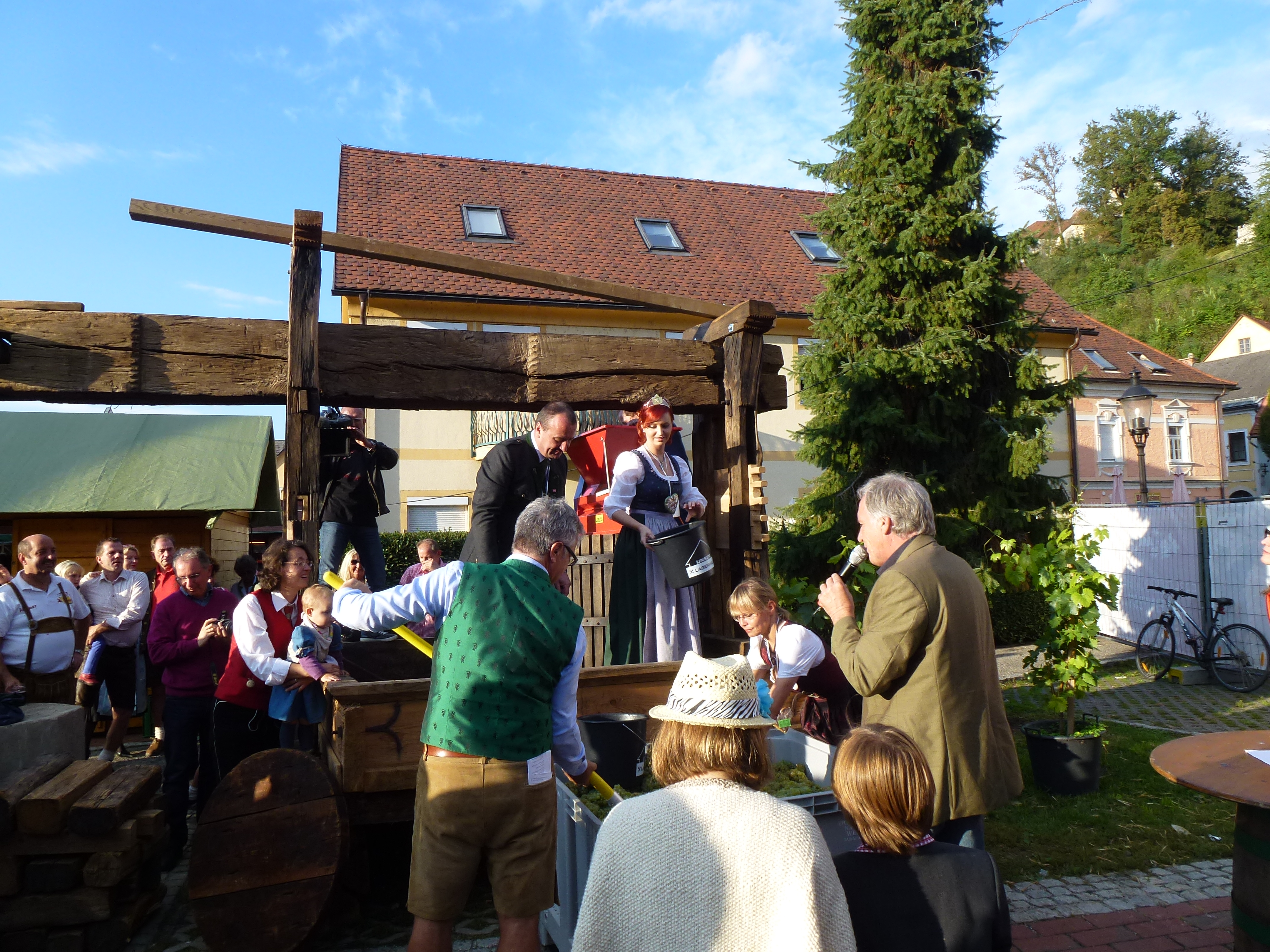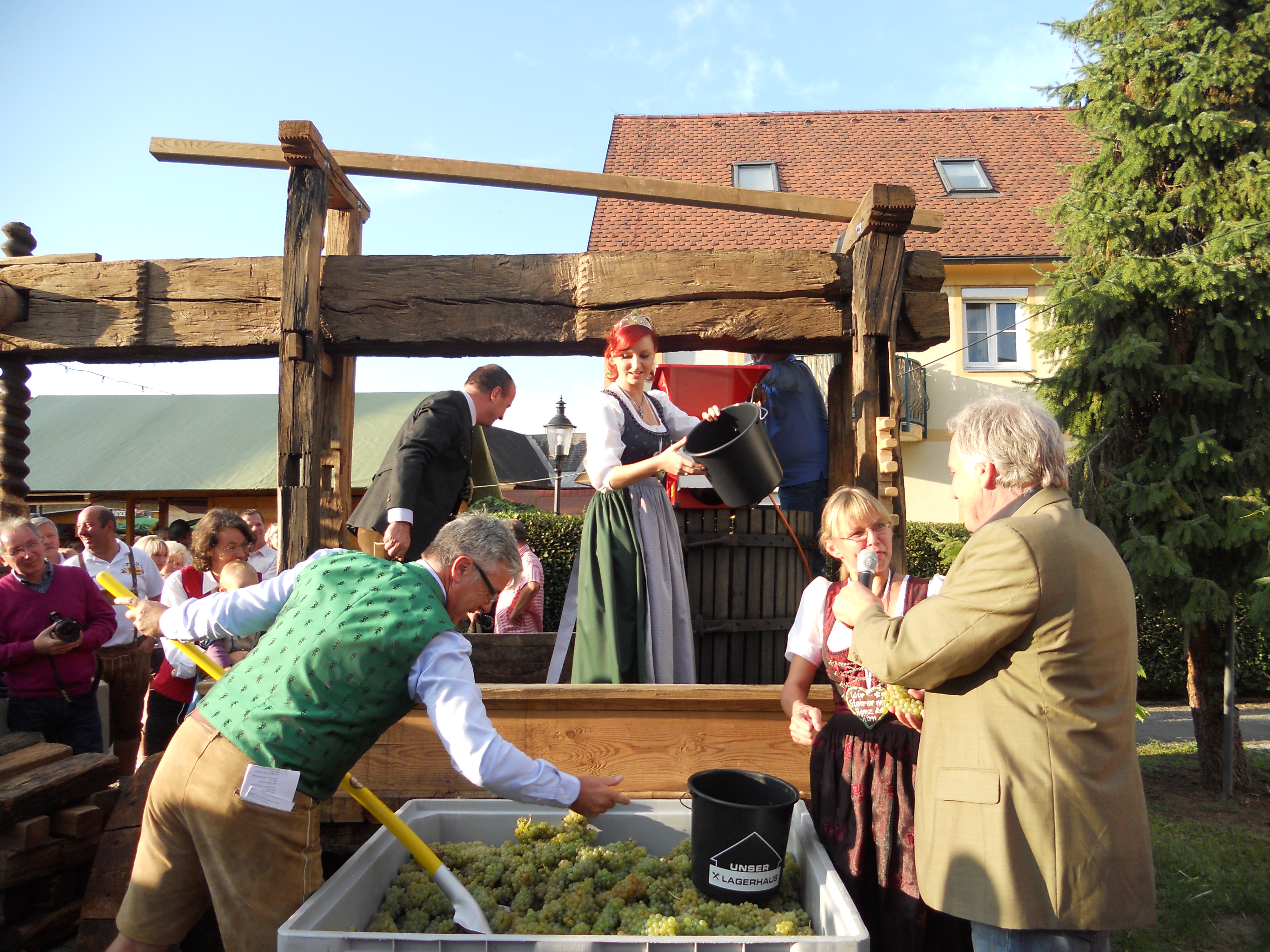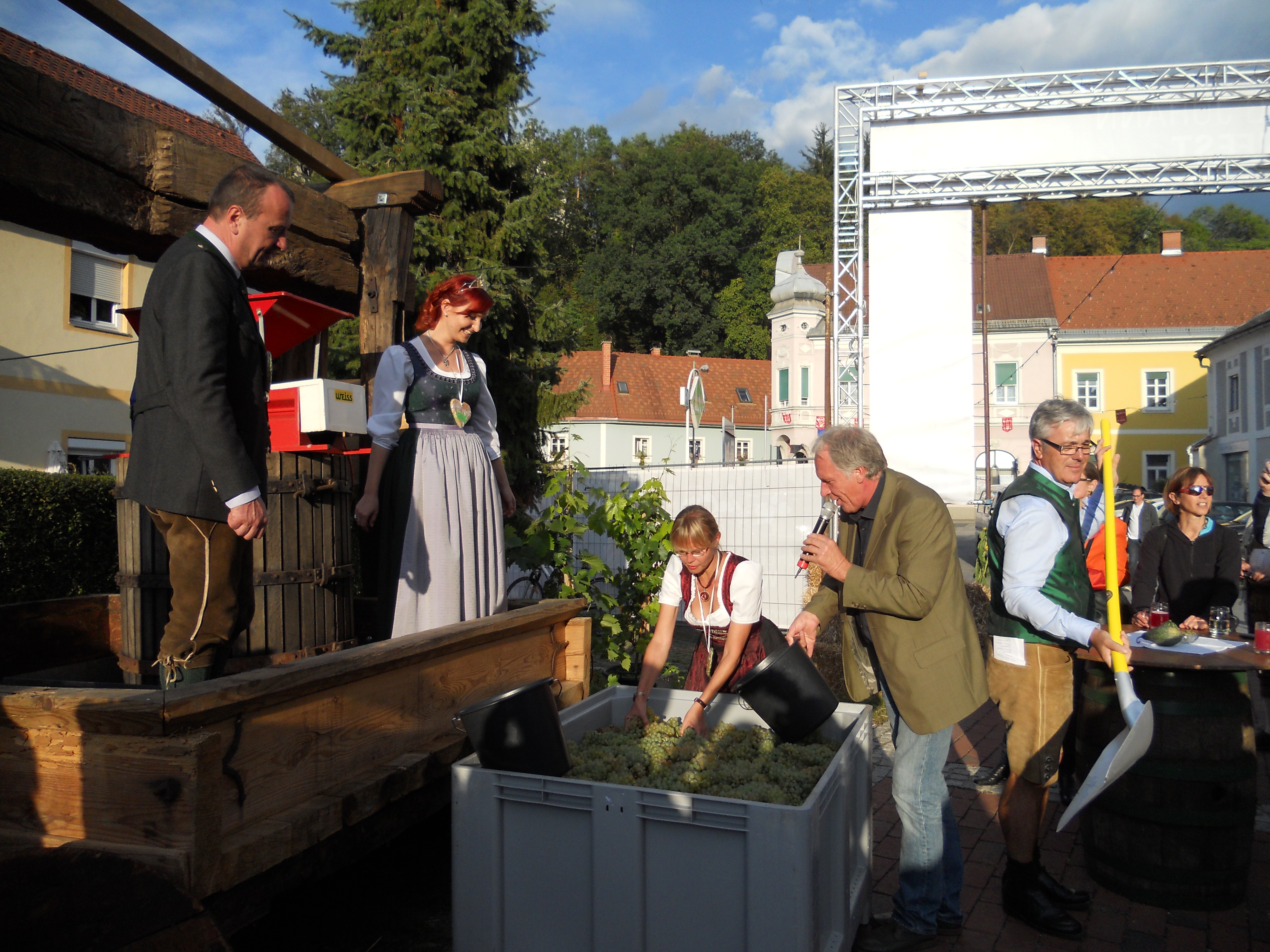 Beim Erzherzog Johann Weinfest in Ehrenhausen gab es ein Schauweinpressen auf einer 99 Jahre alten Baumpresse mit Bundesministerin Dr. Beatrix Karl und Weinhoheit Bernadette Stelzl.