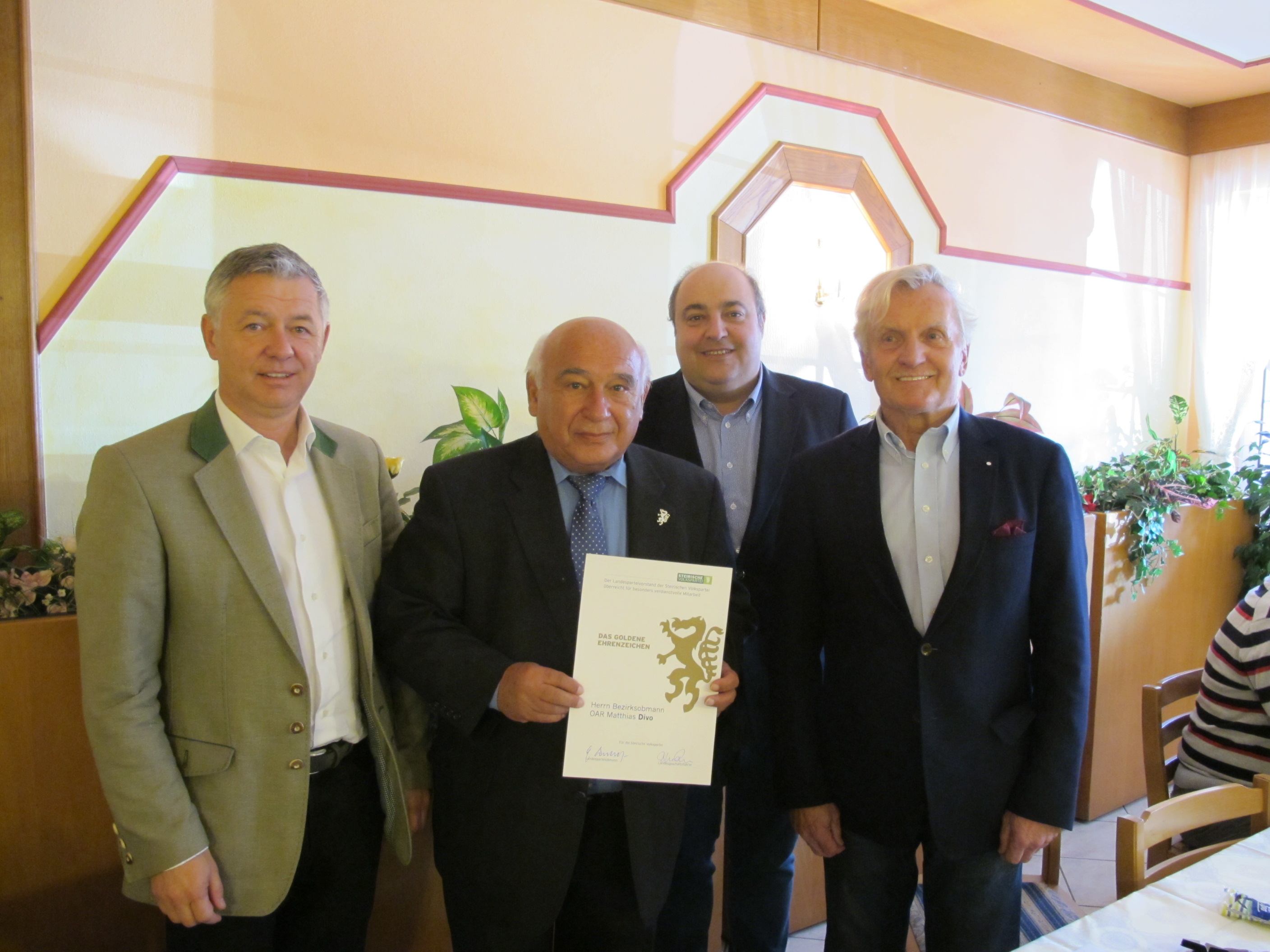 SB-Bezirksobmann OAR Matthias Divo wurde in seiner Funktion bestätigt. SB-Landesobmann Gregor Hammer dankte Matthias Divo für seinen unermüdlichen Einsatz und überreichte das goldene Ehrenzeichen der Steirischen Volkspartei.