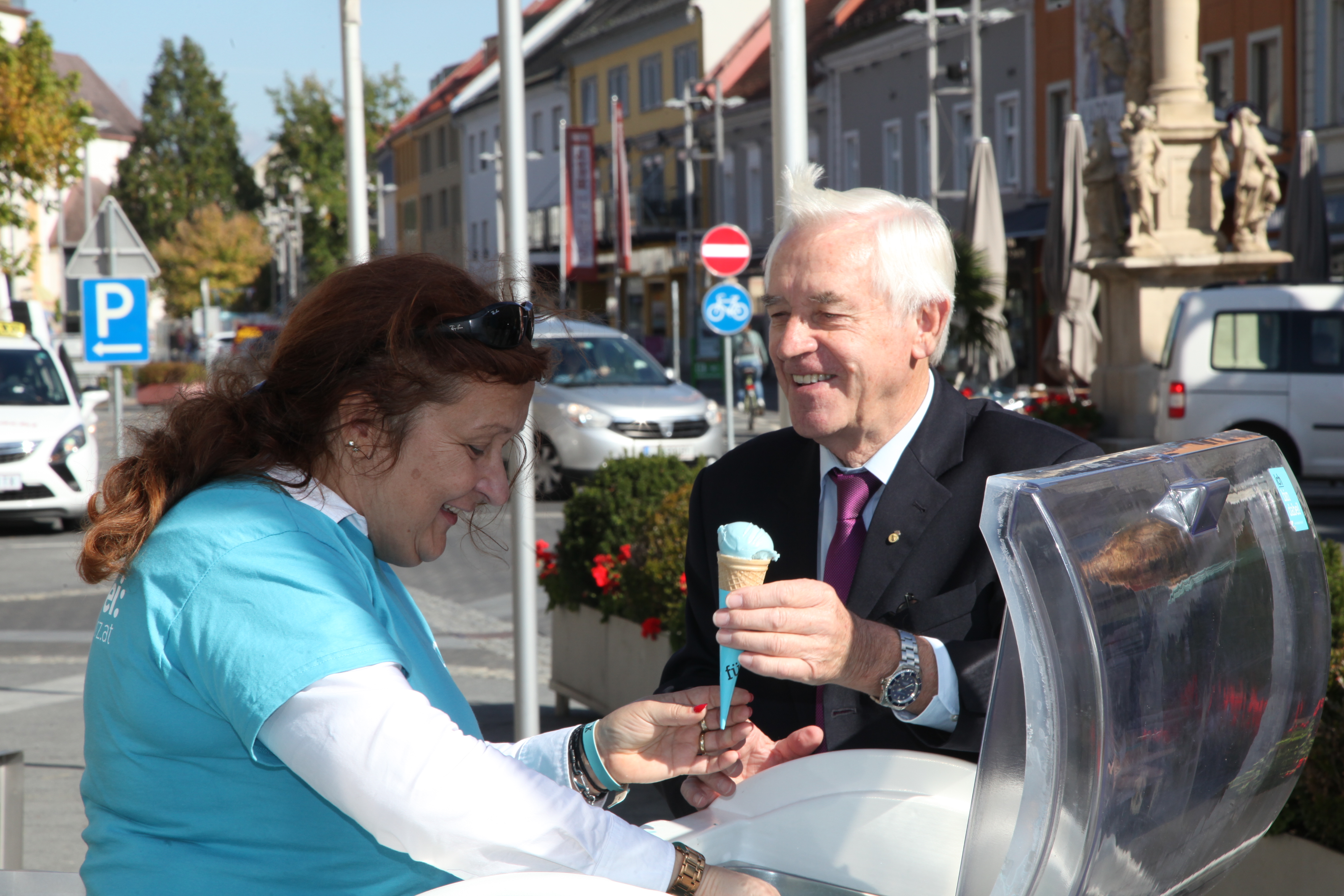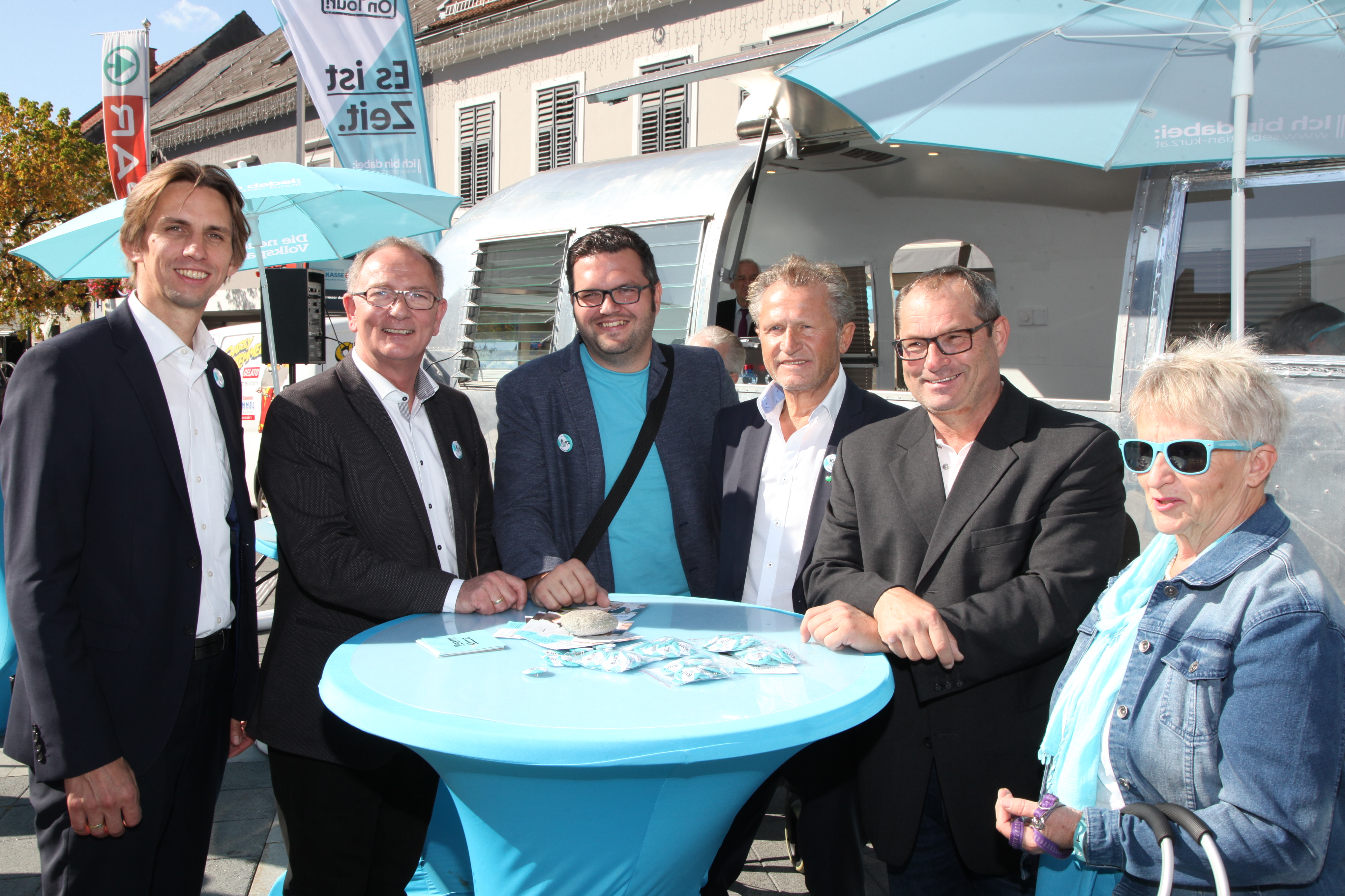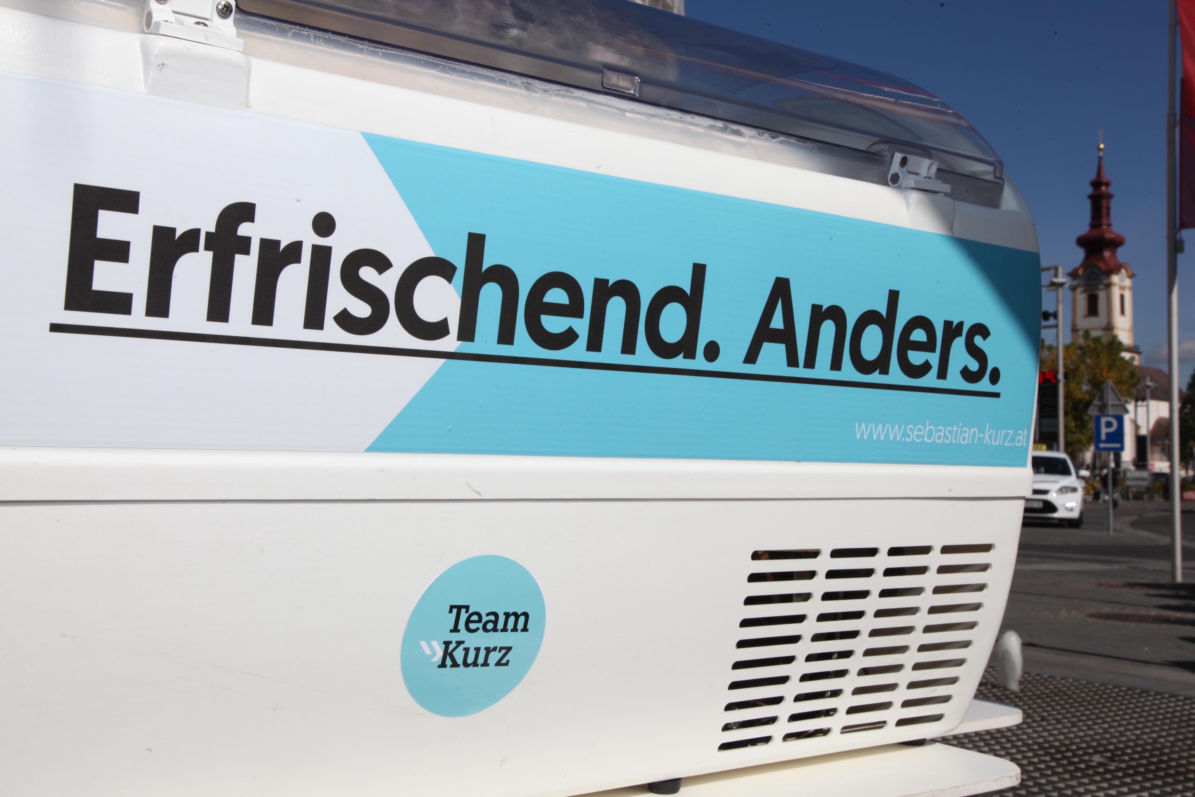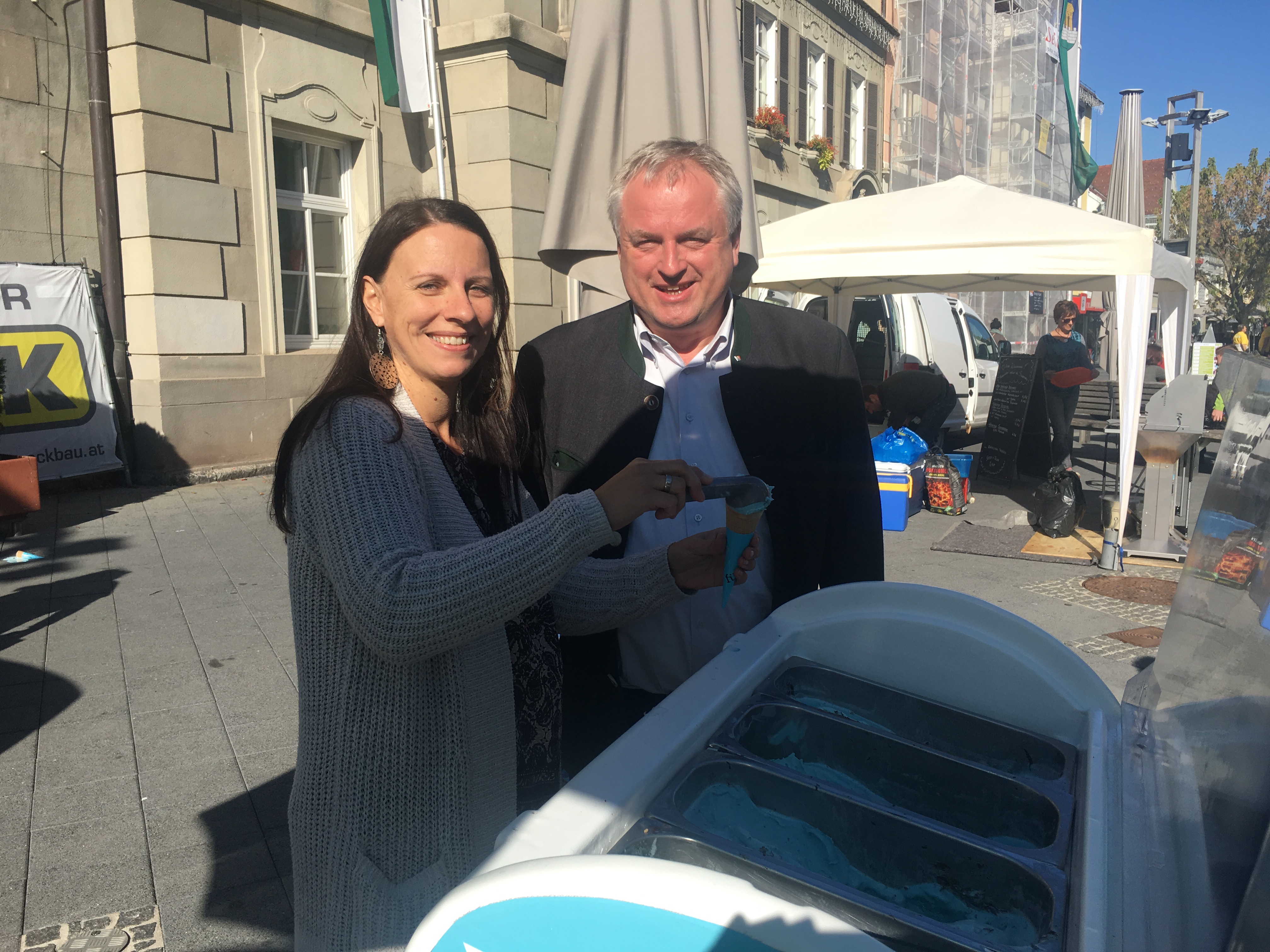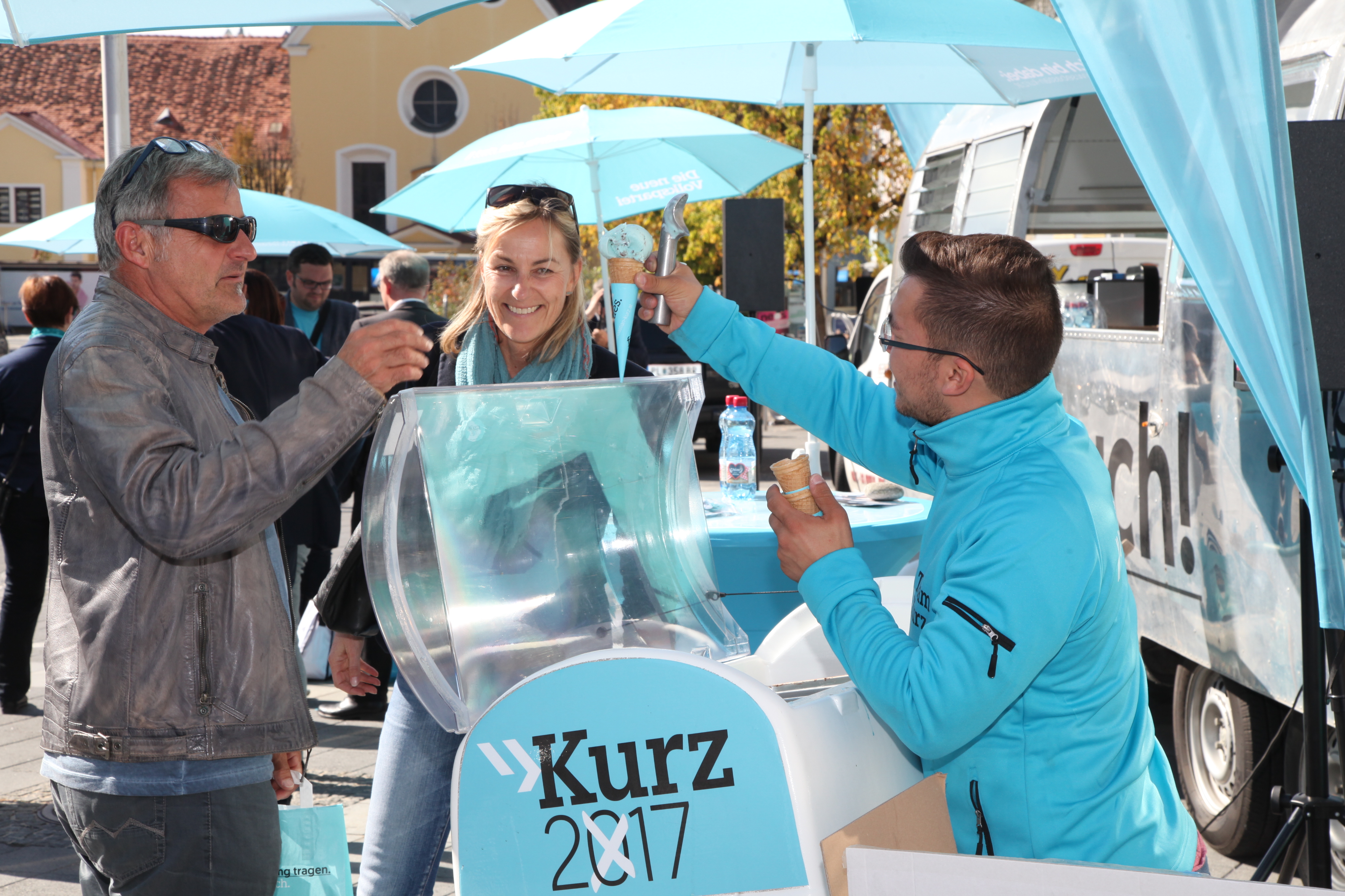 Neben Verteilaktionen in der Bezirkshaupmannschaft, Geschäften, Lokalen und Betrieben, konnten sich die Passanten und Interessierten dann am Hauptplatz beim glänzendem Airstream-Wagen über die Positionen der neuen Volkspartei informieren und dabei ein exklusives Eis in der neuen Parteifarbe genießen. „Die Stimmung ist gut, aber wir dürfen den Tag nicht vor dem Abend loben. In den nächsten Tagen gilt es die Stimmung in Stimmen umzuwandeln“, so der Landesgeschäftsführer abschließend.