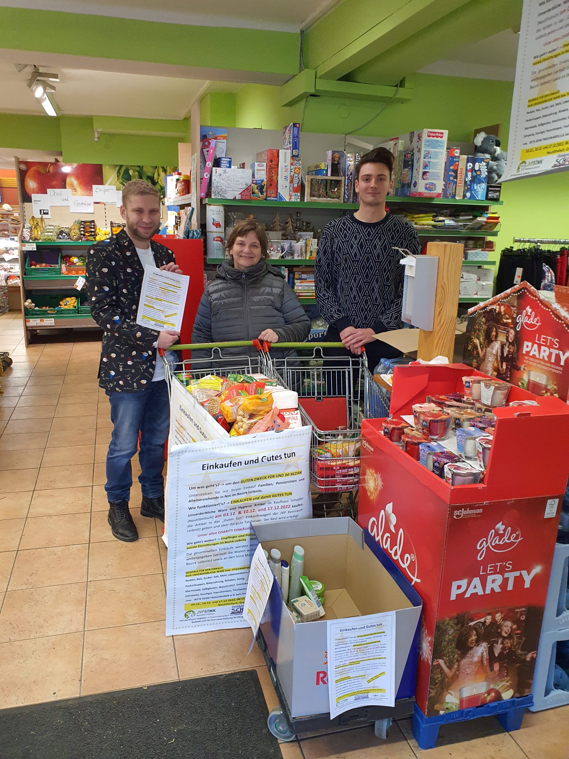 Am 03.12, 10.12 und 17.12.2022 konnte beim Kaufhaus Schadler in Neutillmitsch für die Charity Aktion eingekauft werden. Wie bereits gewohnt wurden auch heuer die gespendeten Waren, unverderbliche Lebensmittel und Hygieneartikel, an den Verein „Steirer mit Herz“ weitergegeben. Dieser verteilt die Waren wiederum an bedürftige Personen aus dem Bezirk Leibnitz. Ein weiterer Teil der Waren kommt dem Vinzi Markt Leibnitz zugute.