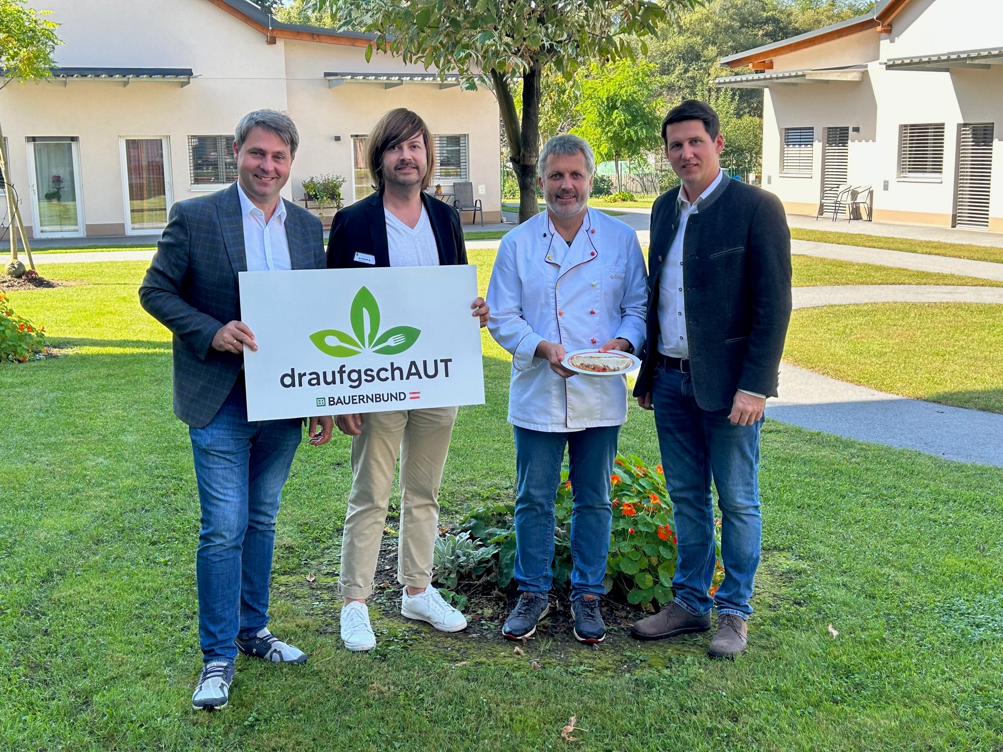 Unsere dritte Station der draufgschAUT Tour führte uns ins Seniorenzentrum Amicalis nach Tillmitsch, wo täglich regional für 108 Bewohnerinnen und Bewohner und 65 Mitarbeiterinnen und Mitarbeiter gekocht wird. LAbg. Gerald Holler und der Leibnitzer Bauernbundobmann Josef Kaiser konnten sich von der Qualität der Speisen überzeugen und Pflegedienstleiter Markus Reinprecht führte die Gäste durch das Haus, das 2020 eröffnet wurde.